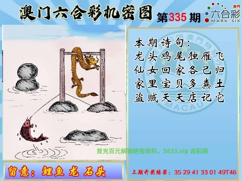 | 335期【解机密图】:开(狗44) 龙头鸡尾独雁飞,仙女回家各己归,家里宝贝多粪土,盗贼天天店记它。 【解】:龙头鸡尾独雁飞可解吉美的生肖,家里宝贝多粪土可解家禽的生肖。 【综合取特】马猪龙狗羊虎 |